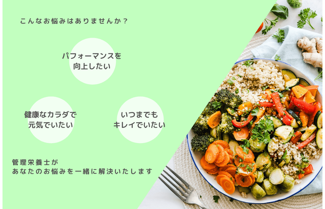 栄養指導・食事指導 美容・エステ・ビューティー ボディメイク・シェイプ 仕事や勉強のパフォーマンス向上 -